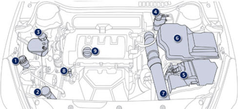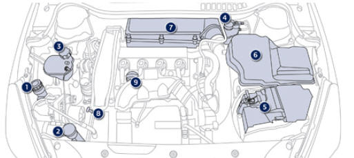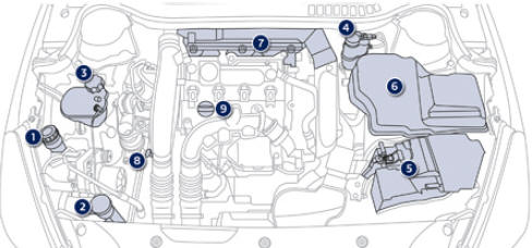Bei Fahrzeugen mit HDi-Motor muss die Kraftstoffanlage entlüftet werden, wenn der Tank komplett leer gefahren wurde; siehe entsprechende Abbildung des Motorraums.