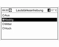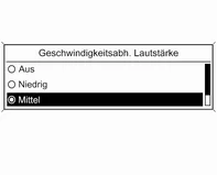 Die geschwindigkeitsabhängige Lautstärkeanhebung kann deaktiviert werden, oder der Grad der Lautstärkeanpassung kann im angezeigten Menü gewählt werden.