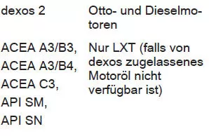 Die Verwendung von Motorölen, die lediglich den Spezifikationen ACEA A1/B1 oder A5/B5 entsprechen, ist untersagt, da dies unter bestimmten Betriebsbedingungen langfristig Motorschäden verursachen kann.
