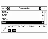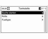 Zum Starten einer Suche nach Tankstellen im Umkreis der aktuellen Fahrzeugposition: Tankstellen wählen.
