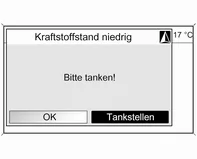Wenn der Kraftstoffstand im Fahrzeugtank niedrig ist, wird eine Warnmeldung angezeigt.