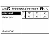 ■ Breitengrad / Längengrad: Auswahl eines Ziels mittels geografischer Koordinaten. Siehe "Auswahl eines Ziels mittels geografischer Koordinaten" unten.