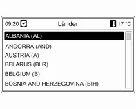Auswählen/Ändern des Landes: das Land-Eingabefeld markieren (siehe Abbildung oben) und den MENUKnopf drücken, um das Menü Länder zu öffnen.