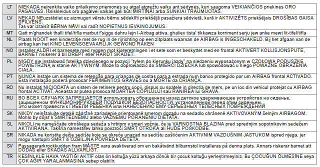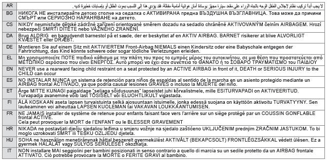 Montieren Sie niemals ein Rückhaltesystem für Kinder "entgegen der Fahrtrichtung" auf einen Sitz dessen Front-Airbag aktiviert ist.