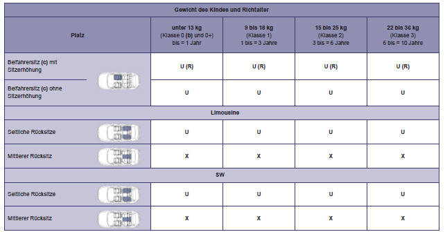 U: Geeigneter Platz für den Einbau eines als Universalsitz zugelassenen Kindersitzes "entgegen der Fahrtrichtung" und/oder "in Fahrtrichtung", der sich mit einem Sicherheitsgurt befestigen lässt.