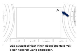 Je nach Fahrsituation und Ausstattung Ihres Fahrzeugs kann Ihnen das System empfehlen, in einen höheren Gang zu schalten. Sie können dieser Empfehlung nachkommen und dabei auch Gänge überspringen.