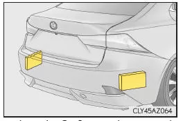 Ein Sensor für den Monitor des toten Winkels ist jeweils innen auf linker und rechter Seite der Heckstoßstange angebracht. Beachten Sie die folgenden Punkte, um sicherzustellen, dass der Monitor für den toten Winkel wirksam funktioniert.