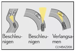 Seien Sie sich der eingestellten Geschwindigkeit bewusst. Wenn das automatische Verzögern/ Beschleunigen nicht angemessen ist, passen Sie die Fahrzeuggeschwindigkeit und den Abstand zwischen Ihrem Fahrzeug und vorausfahrenden Fahrzeugen durch Betätigen der Bremsen usw. an.