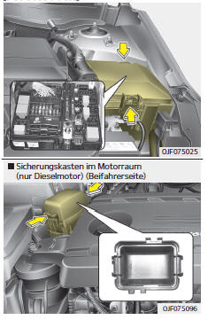 Sicherungskasten im Motorraum den Deckel des Sicherungskastens sicher. Anderenfalls ertönt ein hörbares Klickgeräusch. Feuchtigkeit kann eindringen und elektrische Fehlfunktionen verursachen. |